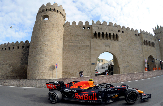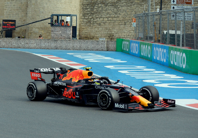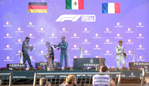 6月6日,紅牛車(chē)隊(duì)墨西哥車(chē)手佩雷茲在比賽中。 6月6日,佩雷茲(左二)、維特爾(右二)和加斯利(右一)在頒獎(jiǎng)儀式上互噴香檳慶祝。