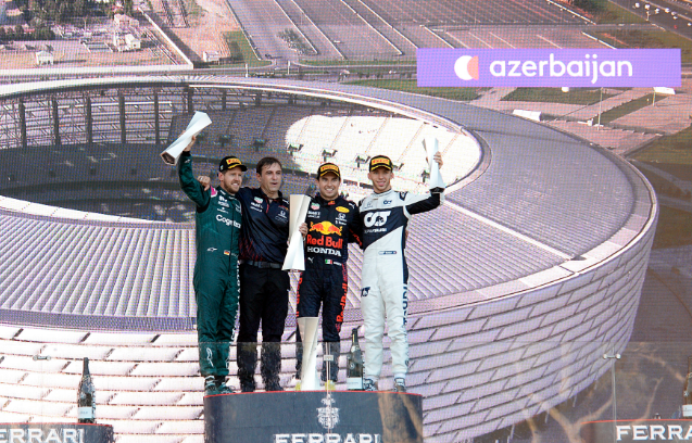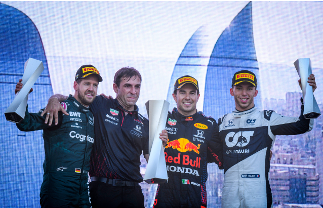 6月6日,冠軍佩雷茲(右二)、亞軍維特爾(左二)和季軍加斯利(右一)在頒獎(jiǎng)儀式上合影留念。