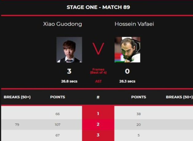與瓦菲-阿尤里的這場比賽,肖國棟只有贏下比賽才能晉級,而肖國棟也沒讓人失望,他以3-0輕松勝出小組第一晉級。第一局,肖國棟與瓦菲-阿尤里打得比較膠著,在拉鋸戰(zhàn)中,他以66-38先勝一局,1-0先拔頭籌。第二局,瓦菲-阿尤里手感依舊不佳,而肖國棟手感火熱,他打出單桿70分,2-0擴(kuò)大優(yōu)勢。 第三局,肖國棟沒有任何松懈,他一鼓作氣67-5再勝一局,總比分3-0輕松戰(zhàn)勝瓦菲-阿尤里。三輪小組循環(huán)賽結(jié)束之后,肖國棟以2勝1平戰(zhàn)績反超至小組第一,力壓對手強(qiáng)勢晉級。