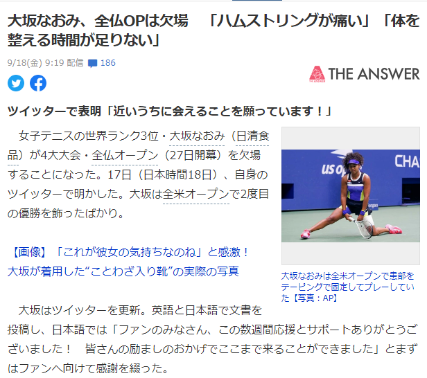 在之前的今年美網(wǎng)女單決賽中,大坂直美逆轉(zhuǎn)阿扎倫卡第二次賽會奪冠。拿到第三個大滿貫冠軍的她,也超越中國名將李娜成為亞洲網(wǎng)球第一人。在美網(wǎng)之前的辛辛那提公開賽上,原本就應(yīng)該是大坂直美與阿扎倫卡兩個人爭冠,但大坂直美因為左大腿疼痛放棄了那場比賽。在隨后征戰(zhàn)美網(wǎng)的時候,大坂直美左大腿都是緊纏繃帶出戰(zhàn)。 大坂直美在個人社交平臺上用日文和英文做出退賽法網(wǎng)的解釋,她表示:“我的腿部依舊有疼痛感,所以我沒有時間準(zhǔn)備紅土比賽,美網(wǎng)和法網(wǎng)這兩場大滿貫賽事對于我而言,在時間上實在太接近了?!贝筵嘀泵肋€表示:“感謝你們在過去三周給我的支持,遺憾的是,我因傷不能出戰(zhàn)今年法網(wǎng),希望賽事組織者和球員一切都好,想念你們,希望盡快回歸?!?emsp; 日媒指出大坂直美不太擅長打紅土,她從2016年開始連續(xù)四年征戰(zhàn)法網(wǎng),2016年打進(jìn)第三輪2017年止步第一輪,2018年和去年也都只是打到第三輪。目前這屆法網(wǎng)已經(jīng)有女單世界第一巴蒂和新科美網(wǎng)冠軍大坂直美退賽,距離今年法網(wǎng)開賽還有9天,接下來還可能會有哪些球星退賽非常值得關(guān)注。 9月16日日本網(wǎng)球協(xié)會在網(wǎng)上召開常務(wù)理事會,決定推遲向大坂直美發(fā)今年美網(wǎng)奪冠的獎金。受到新冠疫情的影響,今年的ATP日本公開賽取消,導(dǎo)致該協(xié)會損失至少10億日元(大約6450萬人民幣)。日本網(wǎng)球協(xié)會去年總收益為23億日元(約1.48億人民幣),今年受疫情影響估計達(dá)不到去年收入的一半水平。鑒于目前嚴(yán)峻的財務(wù)狀況,日本網(wǎng)球協(xié)會決定推遲向大坂直美發(fā)今年美網(wǎng)奪冠的獎金。